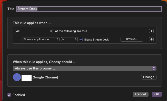ちなみに、上記の設定だとStreamDeck経由で開く場合は必ずChromeの特定のユーザーになりますが、Choosyでは複数のルールを設定できるので、先程のルールの上位ルールに追加すれば特定のパターンのみは別ユーザーにする等の挙動も可能です。